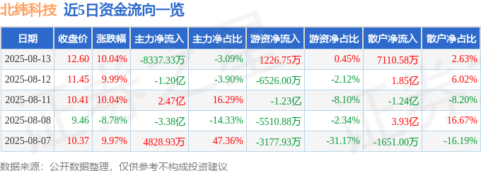 8月13日的资金流向数据方面,主力资金净流出8337.33万元,占总成交额3.09%,游资资金净流入1226.75万元,占总成交额0.45%,散户资金净流入7110.58万元,占总成交额2.63%。